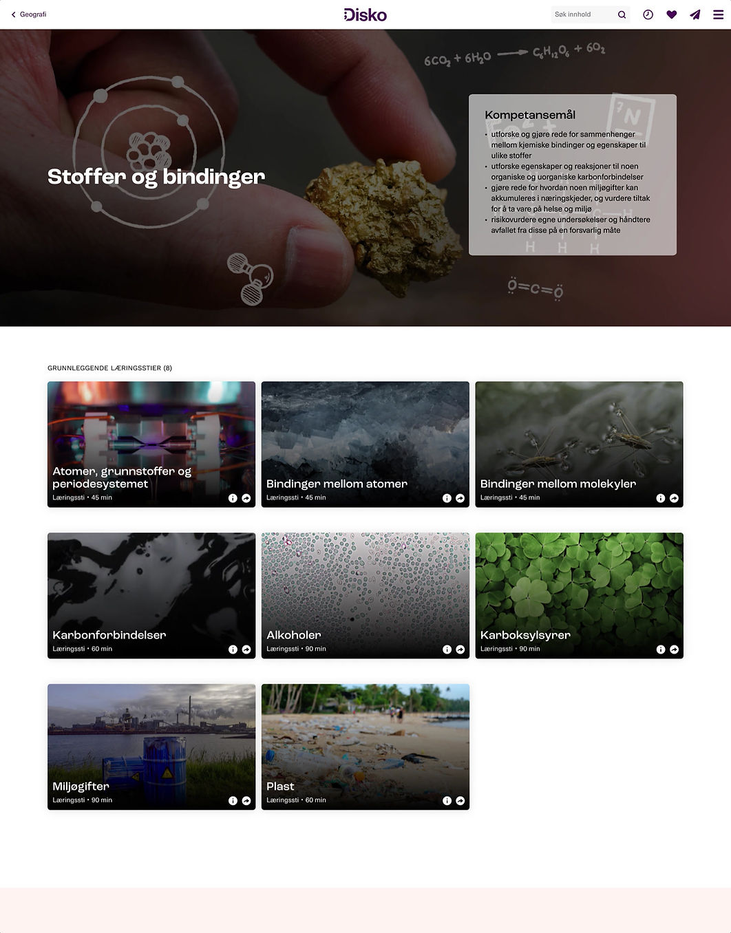 Disko skulle være både levende og aktuelt. Lærere og elever skal presenteres med rikt innhold når de leter, men også fokus under læring. Redaksjonen har produsert og satt sammen læringsstier bestående av ulike komponenter, som artikler, videoer og oppgaver.